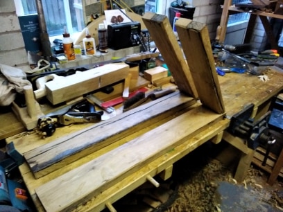 The door has been made entirely from recycled materials. The hinges are made from an oak banister I pulled out the river in March. The door itself is salvaged scaffolding boards rip sawn to the dimensions that I needed. This scavenging of resources did extend the build time as ever plank and pole had to be ripped to dimensions and then planed square and smooth. In total I used one oak banister, one 7ft scaffolding board, one 5ft scaffolding board and some maple cuttings.