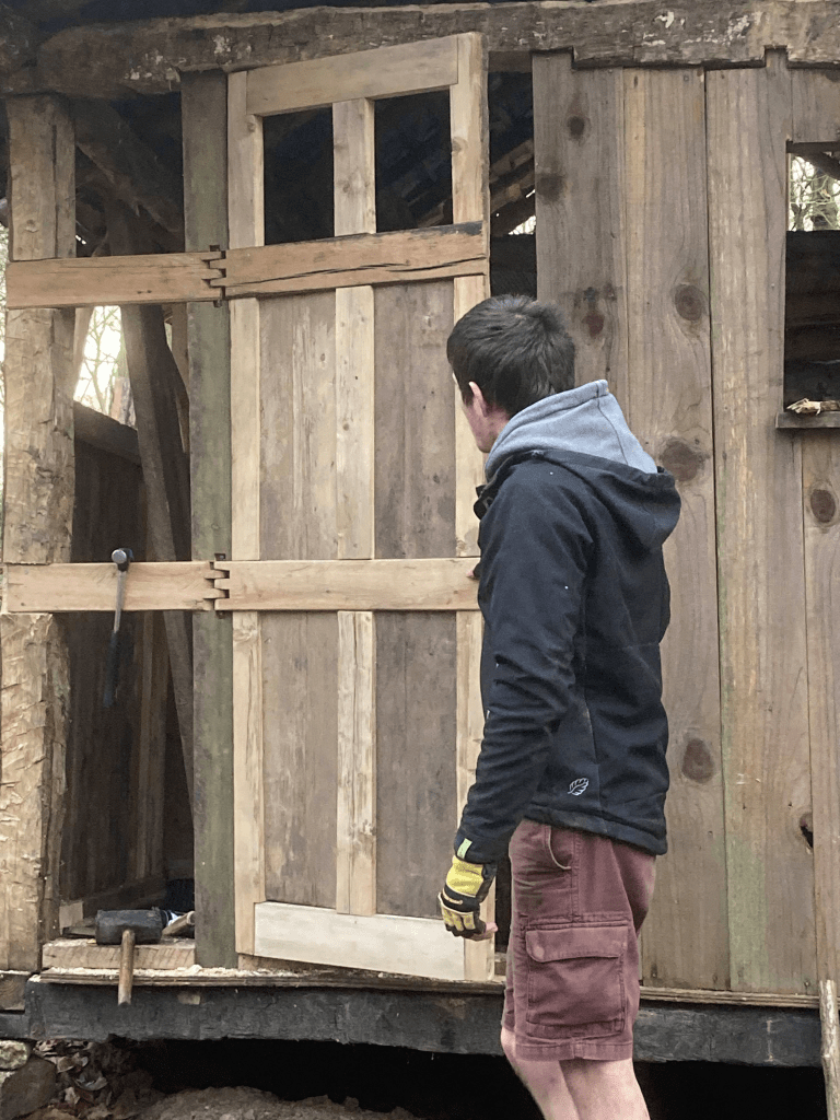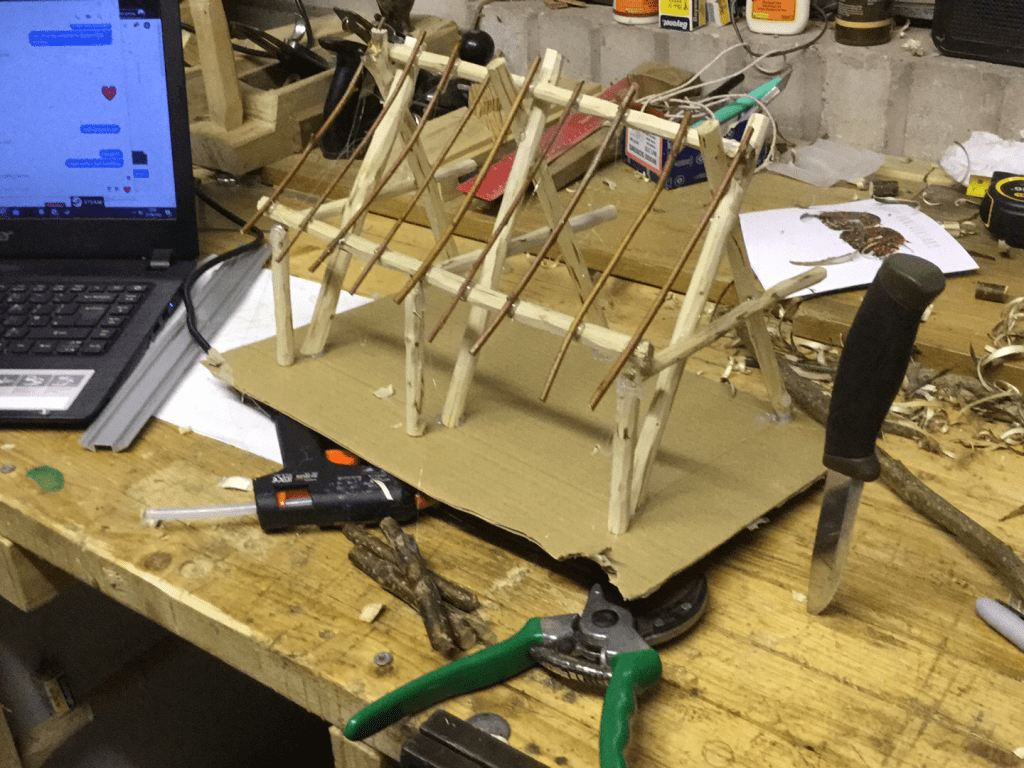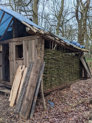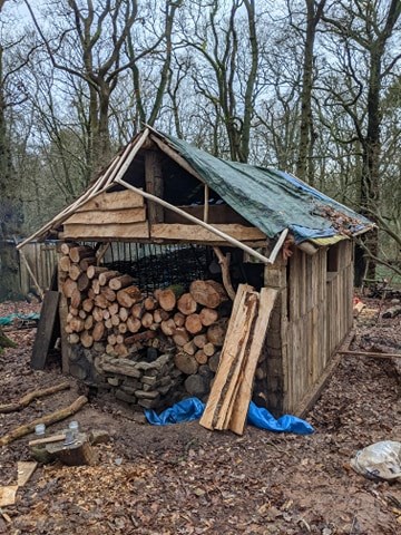 If I stand very still here I will remain dry. Batons and shingles. What a gorgeous roof I have made.Hazel coppice is doing rather well.Perhaps one of my favourite den photos. Was a very soggy day that.I am very happy with how far the build has come so far. New tool has arrived and will hopefully speed up the jobs. Welcome little blue.Window frames going up and my oh my who is that handsome fella in the background.A good evening in the cabin.There be a Laurence in the window! Sweet chestnut coppice year one. Workshop concept designs.