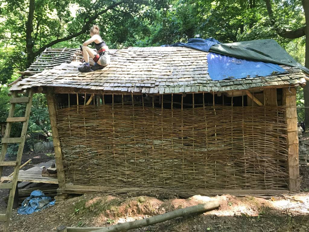 And so with us and the last shingles exhausted we took the rest of the evening off. Sadly the north side was not fully finished with about 60 shingles required to get it finally finished. That said this is a huge miles stone as we have fully covered the inside portion of the cabin with shingles on the north side. We are on the home stretch now. Need to do the final bit of weaving and cob on the north wall, put one or two final pallet planks on the porch loft and then the cabin exterior is done and I can get to work on the interior furniture and layout. We are doing well.