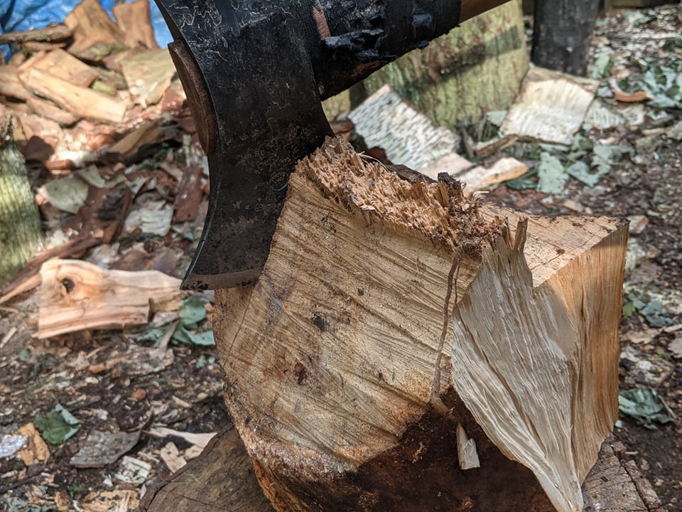 Next to go was a dead standing silver birch tree. Hannah took up the grunt work and threw on the chainsaw gear in the beating sun. She quickly had it logged up. To our amazement the tree was very muchly still alive in the centre despite not having foliage for the last 3 years. This tree was wheelbarrowed back using the new den wheelbarrow ready to be split into logs. The saw used was a Husky 550. Once the logs were hauled back, I split them into small stove sided pieces with the Gransfors double bit axe. This was fun and satisfying. Feels like a long time since I have just spent a good couple days splitting and hauling logs.